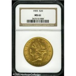 <B>1905 $20 MS61 NGC.</B></I> Fully lustrous and well struck with the typical scattering of abrasions around the surfaces.<BR><I>From The Richard J. Chouinard Collection of United States Coins, Part Two.</B></I> Lot:9398