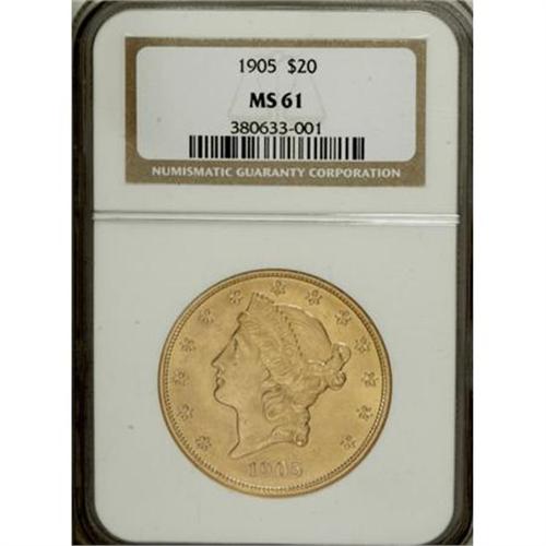<B>1905 $20 MS61 NGC.</B></I> Whispers of green visit the dusky yellow-gold surfaces of this sharply struck Liberty double eagle. Though the surfaces show few individually distracting abrasions, the fields and devices display enough wispy marks to account for the grade.<BR><BR><B>Coin Engraver:</B> James B. Longacre<BR><BR><b>Shipping:</b> Coins & Currency (<a target="_blank" href="http://www.heritageauctions.com/common/shipping.php">view shipping information</a>)