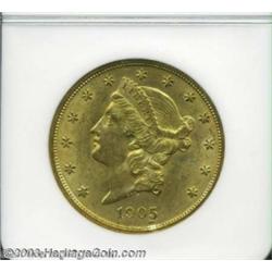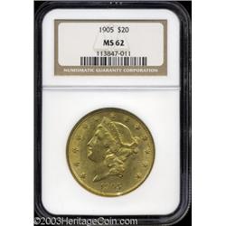 <table><tr><td><TABLE cellSpacing=0 cellPadding=0 width="100%" bgColor=#000000 border=0><TBODY> <TR><TD width="100%"><TABLE cellSpacing=1 cellPadding=3 width="100%" border=0><TBODY><TR><TD width="100%" bgColor=#79735c><FONT face=arial color=#ffffff size=3><B>Description</B> </FONT></TD></TR><TR><TD width="100%" bgColor=#ffffff><FONT face=arial size=2><B>1905 $20 MS62 NGC.</B></I> With a low mintage of only 59,011 pieces, the 1905 is the rarest twentieth century Liberty double eagle. This example is well struck, highly lustrous, and exhibits lovely green-gold color. The coin has too many obverse bagmarks to warrant consideration for a higher grade, and there is a noticeable ding on the lower obverse rim. The bright, flashy reverse only shows a few trivial blemishes. Population: 97 in 62, 12 finer (7/03). </FONT></TD></TR></TBODY></TABLE></TD></TR></TBODY></TABLE><BR><A name=PricesRealized></A><TABLE cellSpacing=0 cellPadding=0 width="100%" bgColor=#000000 border=0><TBODY><TR><TD width="100%"><TABLE cellSpacing=1 cellPadding=3 width="100%" border=0><TBODY><TR><TD width="100%" bgColor=#79735c><A name=PR><FONT face=arial color=#ffffff size=3><B>Previous Prices from Heritage Auctions</B> </FONT></A></TD></TR><TR><TD bgColor=#f6f6ed><TABLE cellSpacing=0 cellPadding=0 width="100%" border=1><TBODY><TR><TD align=middle width="33%"><B>Date</B></TD><TD align=middle width="33%"><B>Service</B></TD><TD align=middle width="33%"><B>Price</B></TD></TR><TR bgColor=whitesmoke><TD width="33%"><B>03/23/2003</B></TD><TD width="33%">PCGS</TD><TD width="33%">$2,760.00</TD></TR><TR bgColor=whitesmoke><TD width="33%"><B>01/12/2002</B></TD><TD width="33%">NGC</TD><TD width="33%">$2,300.00</TD></TR><TR bgColor=whitesmoke><TD width="33%"><B>10/06/2001</B></TD><TD width="33%">PCGS</TD><TD width="33%">$2,449.50</TD></TR><TR bgColor=whitesmoke><TD width="33%"><B>06/02/2001</B></TD><TD width="33%">NGC</TD><TD width="33%">$2,932.50</TD></TR><TR bgColor=whitesmoke><TD width="33%"><B>11/18/1999</B></TD><TD width="33%">PCGS</TD><TD width="33%">$2,944.00</TD></TR><TR bgColor=whitesmoke><TD width="33%"><B>08/07/1998</B></TD><TD width="33%">NGC</TD><TD width="33%">$3,910.00</TD></TR><TR bgColor=whitesmoke><TD width="33%"><B>08/17/1996</B></TD><TD width="33%">NGC</TD><TD width="33%">$2,420.00</TD></TR><TR bgColor=whitesmoke><TD width="33%"><B>09/01/1997</B></TD><TD width="33%">PCGS</TD><TD width="33%">$3,520.00</TD></TR><TR bgColor=whitesmoke><TD width="33%"><B>05/01/1994</B></TD><TD width="33%">PCGS</TD><TD width="33%">$2,420.00</TD></TR><TR bgColor=whitesmoke><TD width="33%"><B>03/01/2000</B></TD><TD width="33%">PCGS</TD><TD width="33%">$3,680.00</TD></TR></TBODY></TABLE></TD></TR><TR><TD bgColor=#ffffff><FONT face=arial size=1 ?>PLEASE NOTE: All prices realized reflect the final hammer price PLUS the buyer's premium in auctions that charge a buyer's premium. Each item has a notation at the top of the listing indicating whether that lot included a buyer's premium. Example: A item that sells with a final hammer price of $100 and a 20% buyer's premium will display with a price realized of $120. All information listed is intended to be as accurate as possible, but errors are possible. Please use this guide carefully and inform us of any inaccuracies. </FONT></TD></TR></TBODY></TABLE></TD></TR></TBODY></TABLE><BR><TABLE cellSpacing=0 cellPadding=0 width="100%" bgColor=#000000 border=0><TBODY><TR><TD width="100%"><TABLE cellSpacing=1 cellPadding=3 width="100%" border=0><TBODY><TR><TD width="100%" bgColor=#79735c colSpan=6><FONT face=arial color=#ffffff size=3><B>Price Guide*</B> </FONT></TD></TR><TR bgColor=#f6f6ed><TD align=middle><B>Grade</B> </TD><TD align=middle><B>Coin World<BR>(Trends)</B> </TD><TD align=middle><B>Numismedia<BR>Retail</B> </TD><TD align=middle><B>Numismedia<BR>Wholesale</B> </TD><TD align=middle><B>Coin<BR>Universe</B> </TD><TD align=middle><B>Heritage<BR>Value Index</B> </TD></TR><TR bgColor=#ffffff><TD align=middle>61</TD><TD align=right>---</TD><TD align=right>---</TD><TD align=right>$1,350.00</TD><TD align=right>$1,750.00</TD><TD align=right>$1,917.50</TD></TR><TR style="FONT-WEIGHT: bold" bgColor=#cccfdd><TD align=middle>62</TD><TD align=right>$5,000.00</TD><TD align=right>---</TD><TD align=right>$3,100.00</TD><TD align=right>$3,500.00</TD><TD align=right>$3,779.38</TD></TR><TR bgColor=#ffffff><TD align=middle>63</TD><TD align=right>$15,000.00</TD><TD align=right>---</TD><TD align=right>$10,000.00</TD><TD align=right>$13,750.00</TD><TD align=right>$9,237.50</TD></TR><TR bgColor=#ffffff><TD colSpan=6><FONT size=1>*All information listed is intended to be as accurate as possible, but errors are possible. No item may be returned or refused based on this information which is provided as a service to our customers. You should contact each pricing source directly to determine the accuracy of this information. </FONT></TD></TR></TBODY></TABLE></TD></TR></TBODY></TABLE><BR><TABLE cellSpacing=0 cellPadding=0 width="100%" bgColor=#000000 border=0><TBODY><TR><TD width="100%"><TABLE cellSpacing=1 cellPadding=3 width="100%" border=0><TBODY><TR><TD width="100%" bgColor=#79735c><FONT face=arial color=#ffffff size=3><B>Population Guide</B> </FONT></TD></TR><TR bgColor=#ffffff><TD align=middle><!-- Begin Output of Population Grid--><TABLE cellSpacing=0 cellPadding=0 width="100%" border=0><TBODY><TR><TD vAlign=center><TABLE cellSpacing=0 width="100%" border=1 cellsadding="3"><TBODY><TR><TD vAlign=center><TABLE cellSpacing=0 cellPadding=3 width="100%" border=1><TBODY><TR><TD vAlign=center align=middle bgColor=#f0f1e8 colSpan=2 <CENTER><FONT face=Arial size=2><B>PCGS Pop </B></FONT><CENTER></CENTER></TD><TD vAlign=center align=middle bgColor=#f0f1e8 colSpan=2><CENTER><FONT face=Arial size=2><B>NGC Pop</B></CENTER></FONT></TD></TR><TR><TD vAlign=center><FONT face=Arial size=2>(62)</FONT> </TD><TD vAlign=center align=right><FONT face=Arial size=2>132</FONT> </TD><TD vAlign=center><FONT face=Arial size=2>(62)</FONT> </TD><TD 