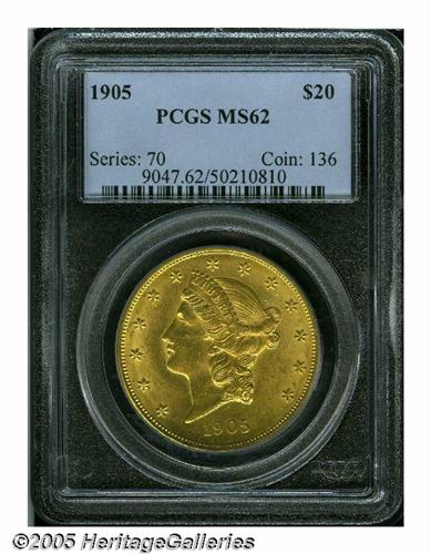1905 $20 MS62 PCGS. Brilliant and frosty, with ju