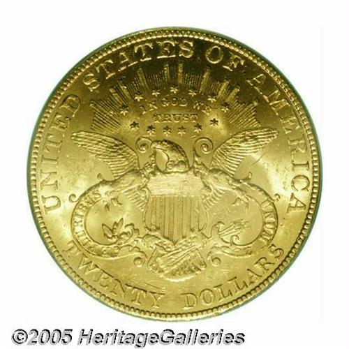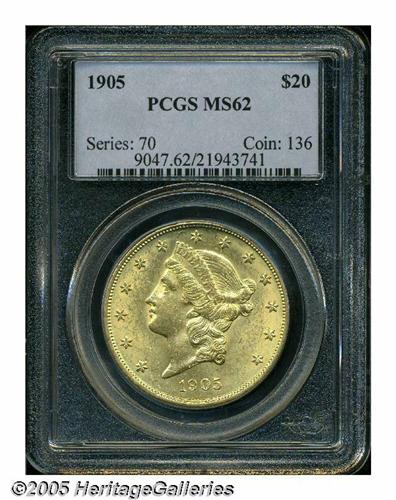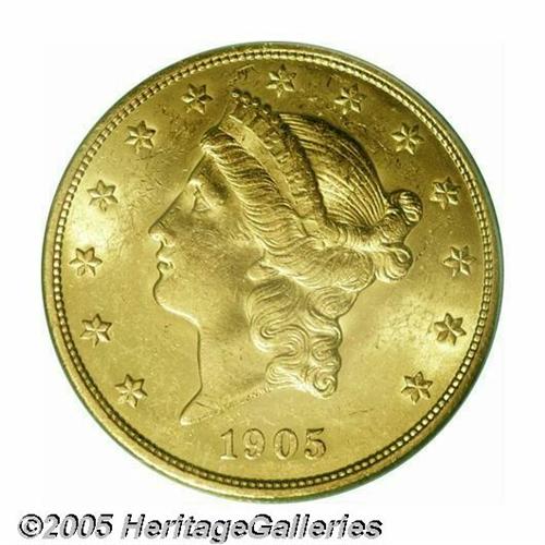 <B>1905<$20> MS62 PCGS.</B></I> Brilliant and lustrous. A handsome example for the grade. The 1905 was heralded by David Akers in 1982 as the "rarest 20th century Liberty Head double eagle," and its status is largely due to its modest mintage of just 59,011 pieces, a figure that's obviously very low by 20-century standards.