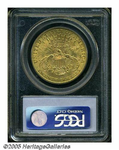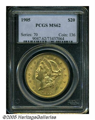 <B>1905<$20> MS62 PCGS.</B></I> Well struck with frosty luster, luscious coloration, and a generally scuffy appearance on obverse and reverse that defines the numerical grade of the piece. With a mintage of only 59,011 pieces the 1905 is the second-rarest 20th century double eagle. Population: 161 in 62, 40 finer (5/05).