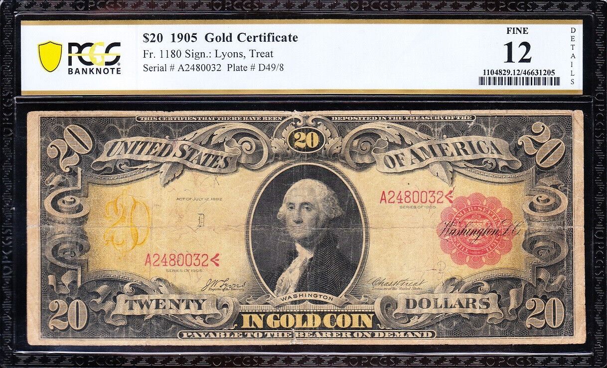 One 1905 $20 Technicolor Gold Certificate PCGS 12.