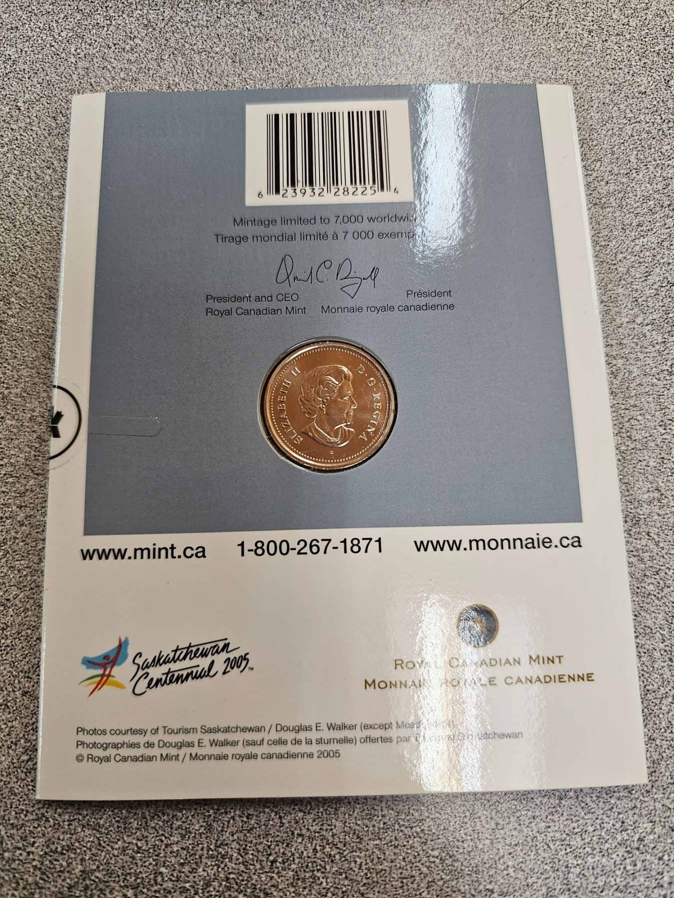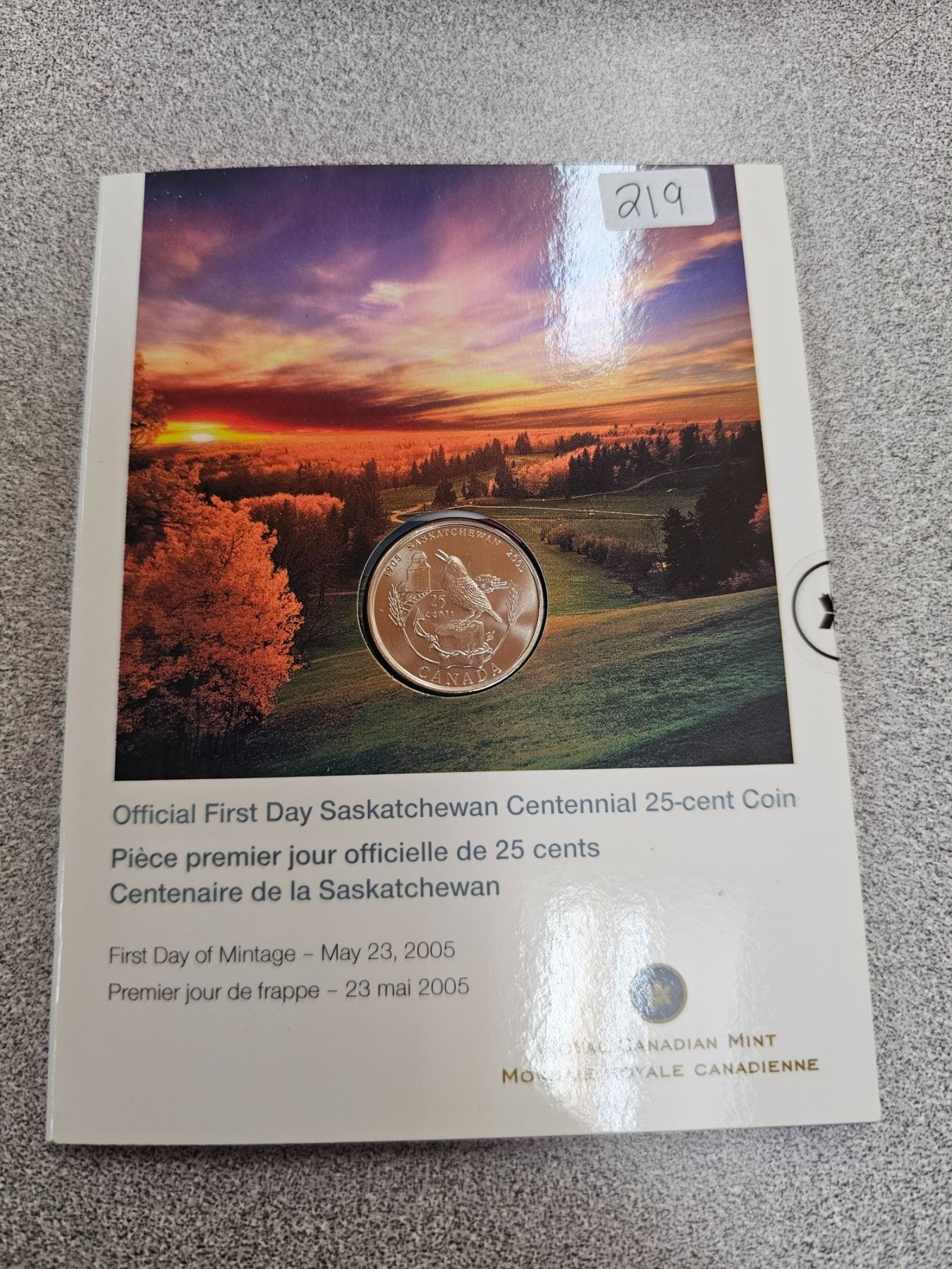 1905 – 2005P Official First Day Saskatchewan Centennial 25 Cent Coin. As issued in unopened Royal Canadian Mint folder.