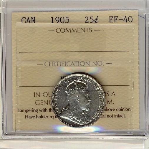 1905 25¢ ICCS EF40. Nice white and lustrous issue.
