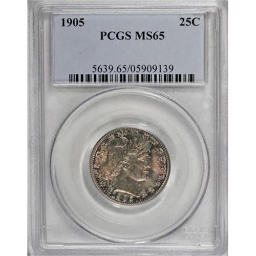 <B>1905 25C MS65 PCGS.</B></I> Violet, ocean-blue, and peach patina enlivens the surfaces of this enticing Barber Gem. Solidly struck with extraordinarily clean fields, a lovely example of this mid-date issue. Population: 16 in 65, 12 finer (9/07).<BR><BR><B>Coin Engraver:</B> Charles E. Barber<BR><BR><b>Shipping:</b> Coins & Currency (<a target="_blank" href="http://www.heritageauctions.com/common/shipping.php">view shipping information</a>)