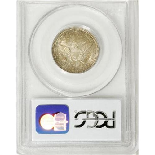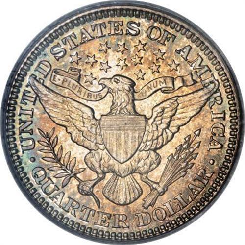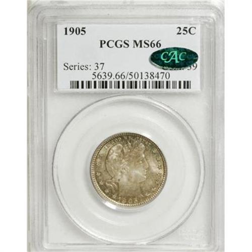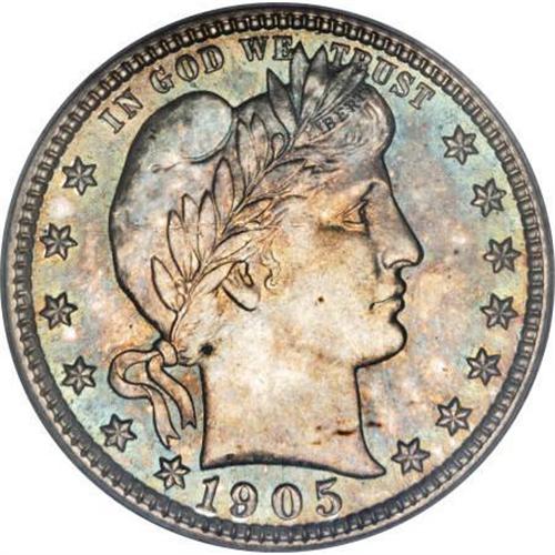<B>1905 25C MS66 PCGS. CAC.</B></I> Two colors predominate in alternating proportions, with more mint-green than pinkish-gold on the obverse, more pinkish-gold than mint-green on the reverse. Flashy luster radiates from both sides, and the strike is bold if not full. A couple of ticks and scrapes, on Liberty's cheek and in the wreath, determine the grade, but this coin would be extremely appealing, both to the Barber quarter and type collectors, as well as to the color aficionados. <BR><I>From The Southwest Collection.</B></I><BR><BR><B>Coin Engraver:</B> Charles E. Barber<BR><BR><b>Shipping:</b> Coins & Currency (<a target="_blank" href="http://www.heritageauctions.com/common/shipping.php">view shipping information</a>)