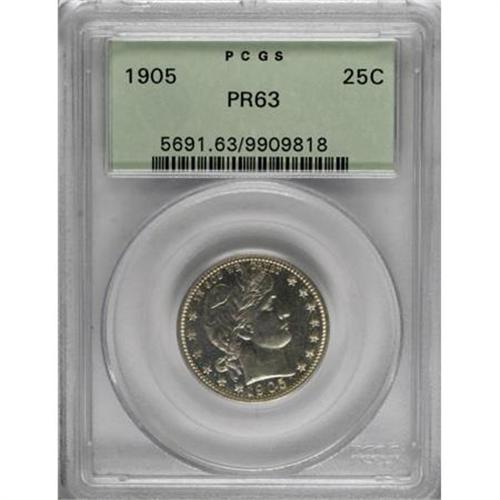 <B>1905 25C PR63 PCGS.</B></I> PCGS Population (44/140). NGC Census: (33/170). Mintage: 727. Numismedia Wsl. Price for NGC/PCGS coin in PR63: $535. (#5691)<BR><BR><B>Coin Engraver:</B> Charles E. Barber<BR><BR><b>Shipping:</b> Coins & Currency (<a target="_blank" href="http://www.heritageauctions.com/common/shipping.php">view shipping information</a>)