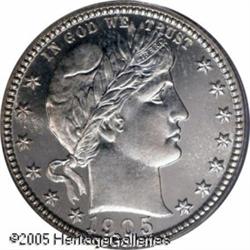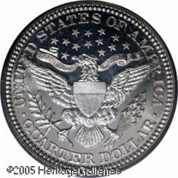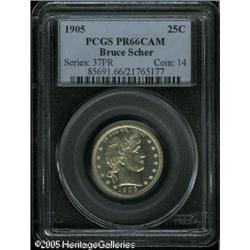 <B>1905 25C PR66 Cameo PCGS.</B></I> The surfaces are essentially brilliant, although a faint hint of milky-white patina is visible when the coin is rotated beneath a light. The cameo effect of the design elements and the fields is, although not strong, readily apparent. Population: 1 in 66 Cameo, 1 finer (1/05).<BR><I>From the Bruce Scher #1 All-Time PCGS Registry Set.</B></I> Lot:4097