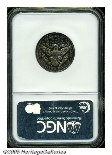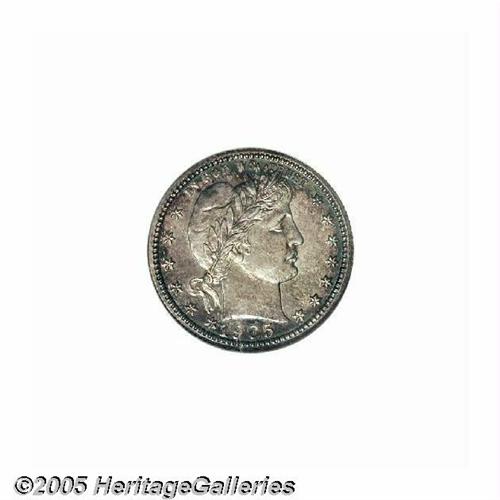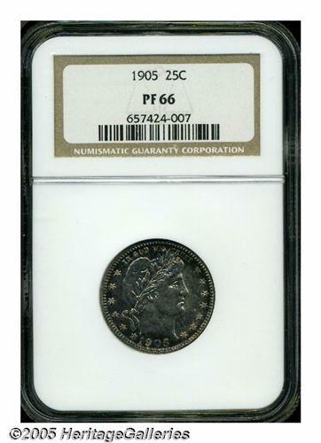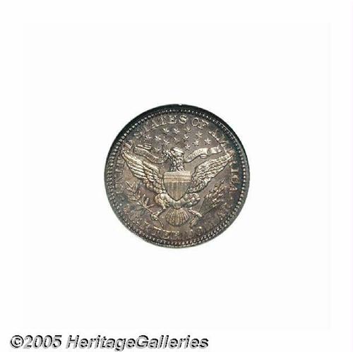 <B>1905<25C> PR66 NGC.</B></I> Endless depths of mirrored reflectivity, in the fields, are overlaid by rich, dark purple-rose and cobalt-blue toning over both sides of the coin. The striking details are uniformly crisp and sharp, and the glittering proof surfaces seem pristine. A more attractive specimen of this low mintage issue would be difficult to come by. A scant 727 pieces were produced. Population: 30 in 66, 25 finer (5/05).