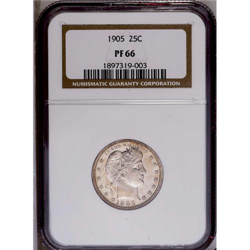 <B>1905<25C> PR66 NGC.</B></I> The jet-black fields exhibit deep, watery reflectivity. The devices and lettering have a golden caste. Razor-sharp striking details are uniformly evident on both sides, and bothersome hairlines or contact marks are absent. An admirable Premium Gem proof quarter.
