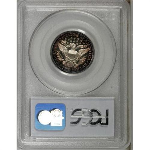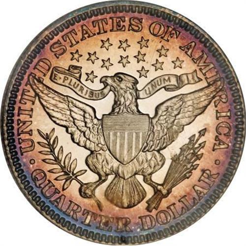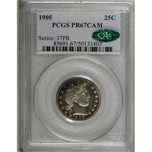 <B>1905 25C PR67 Cameo PCGS. CAC. </B></I> This Superb Gem is the single finest-graded example, at PCGS. In terms of sheer eye appeal, it would be difficult to imagine a superior specimen of the 1905 proof quarter. The bright central devices are silver-gold and essentially untoned, while a band of gorgeous, deep purple-rose toning adorns the inner peripheries of each side. The obverse and reverse rims display attractive electric-blue patina. Immense reflectivity in the fields combines with exquisite frost on the devices to yield great cameo contrast. The surfaces are immaculately preserved. Population: 1 in 67 Cameo, 0 finer (12/07). <BR><BR><b>Shipping:</b> Coins & Currency (<a target="_blank" href="http://www.heritageauctions.com/common/shipping.php">view shipping information</a>)