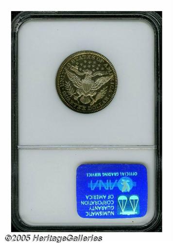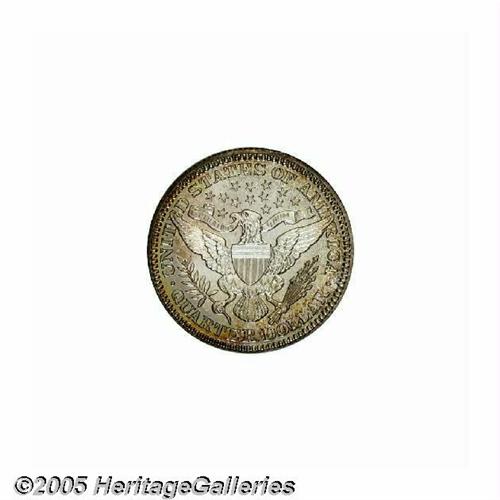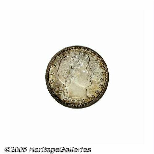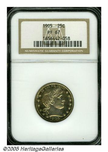 <B>1905<25C> PR67 NGC.</B></I> A highly appealing Superb Gem Proof coin that boasts flecks of deep gold and green peripheral toning, with the central devices nicely frosted. Rarely are these early proofs found in such superlative condition, most were cleaned or mishandled as some point in the last century. This coin retains all the beauty imparted by the Mint, but enhanced by the delicate and colorful toning today. Population: 22 in 67, 4 finer (6/05).