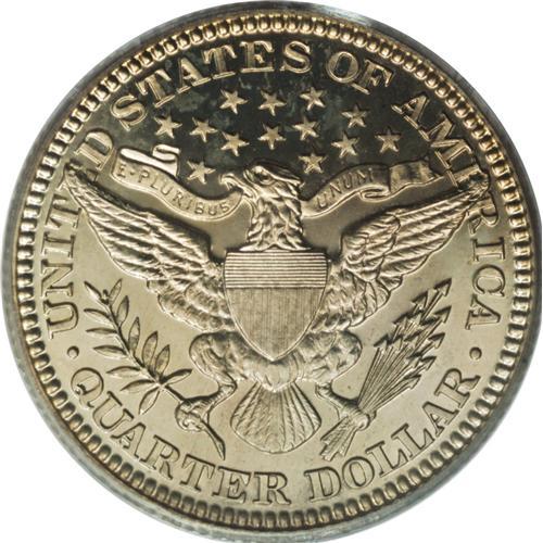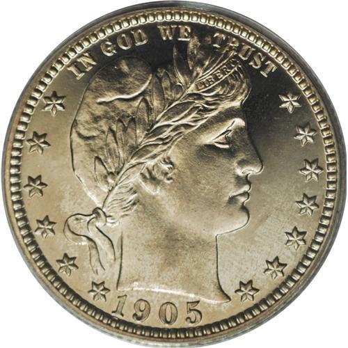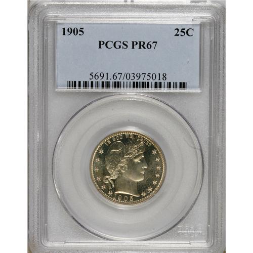 <B>1905 25C PR67 PCGS.</B></I> Though the Mint released 727 proof quarters for 1905, no later issue in the series would achieve a mintage that high. This needle-sharp and strongly reflective piece displays modest contrast and a thin layer of green-gray haze over the obverse fields. An exceptionally clean specimen that should appeal to the Barber collector. Population: 11 in 67, 2 finer (3/07).<BR><BR><b>Shipping:</b> Coins & Currency (<a target="_blank" href="http://www.heritageauctions.com/common/shipping.php">view shipping information</a>)