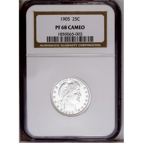 1905 25C PR68 Cameo NGC. Noticeably cameoed in finish, 1905[25C] PR68 Cameo NGC.