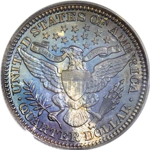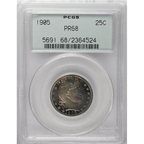 <B>1905 25C PR68 PCGS.</B></I> Based on the PCGS/NGC population figures, a relatively large number of the original proof mintage of 727 pieces is extant today, especially through the Gem level of preservation. PR66 and PR67 examples are much more challenging, and PR68 specimens are virtually unobtainable; to date, a total of four pieces have been seen by both services.<BR> This gorgeous coin displays a tantalizing mixture of teal-blue, rose, and pumpkin-orange iridescent toning that leaves small areas of near-brilliance on each side. Despite being cloaked in color, the impeccably preserved mirrored surfaces burst forth unimpeded and dazzle the viewer with their depth and peerless quality. The design elements have received a bold strike in all areas. Only a small handful of 1905 proof Quarters could possibly compete with this awe-inspiring specimen. Population: 2 in 68, 0 finer (10/06).<BR><BR><b>Shipping:</b> Coin/Currency (<a target="_blank" href="http://www.heritageauctions.com/common/shipping.php">view shipping information</a>)