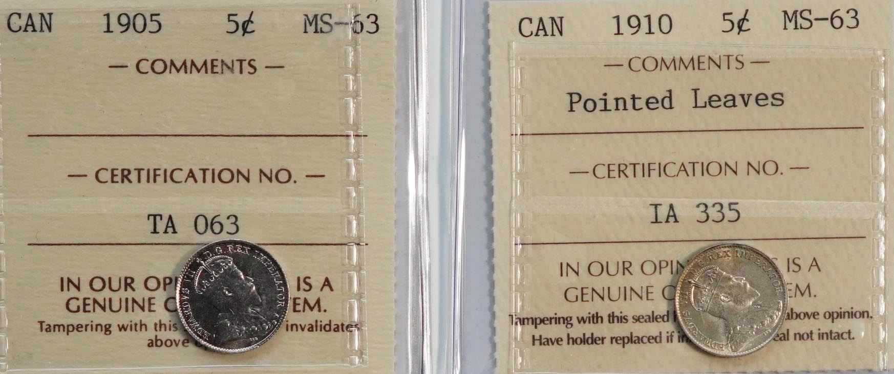 1905 5¢, & 1910 Ptd Lvs both ICCS Choice Mint State-63.