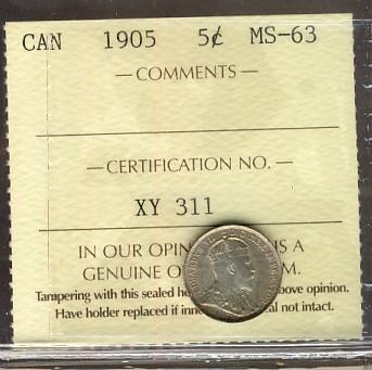 1905 5¢ ICCS MS63, nicely toned. Scarce.