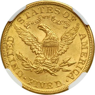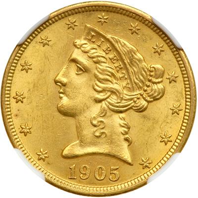 1905 $5 Liberty. NGC graded MS-63. Light golden toning, the fields display full satiny luster with only nominal bagmarks noted (PCGS # 8411) .