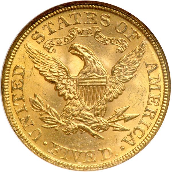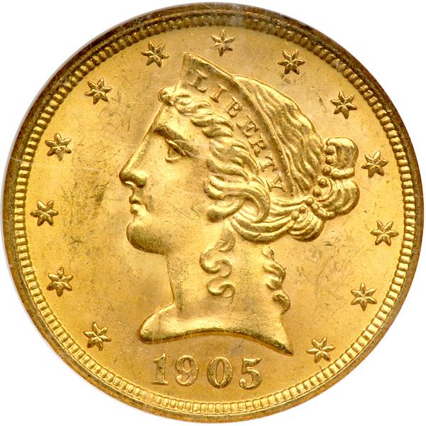 1905 $5 Liberty. NGC graded MS-65. Toned gem. Velvety to satin-like fields almost stagger under the weight of its highly lustrous gold color. Any hint of weakness at that is typically seen is missing on this sharply struck 1905, with the key central areas strongly hit by the dies (PCGS # 8411) .