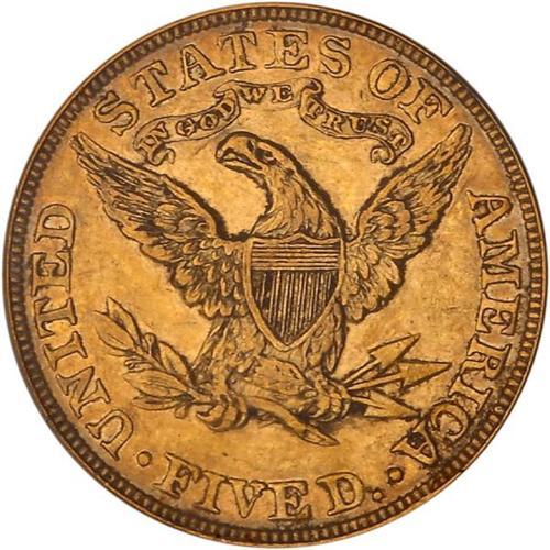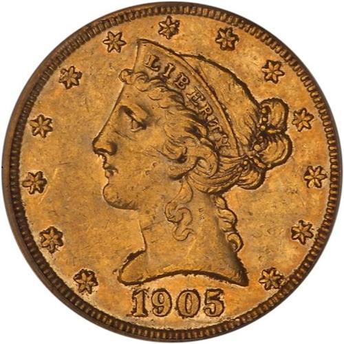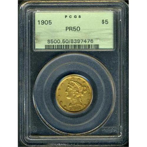 <b>1905 $5 Liberty. PCGS graded Proof 50.</b> Most of the Proof surface now no longer shows, but enough remains to identify it as such. Much warm golden color surrounds the devices and there are a number of smaller contact marks scattered throughout. Rare as a Proof with only 108 pieces originally produced and far fewer remaining today <b>(PCGS # 8500)</b> <i>