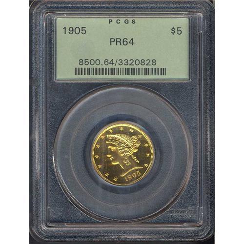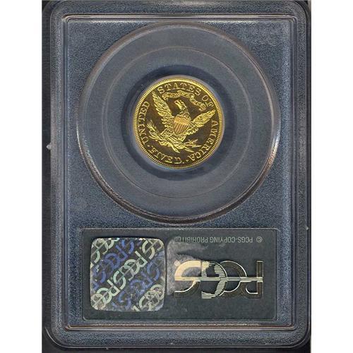 From a proof mintage of only 108 coins. A well struck original bright proof half eagle. Just a couple of light hairlines from the next higher grade. One of seven equal in this condition, with just nine finer certified between the grading services. Very Rare in this condition. Estimated at $12,000 to $18,000.