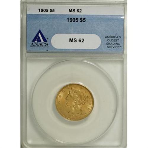 <B>1905 $5 MS62 ANACS.</B></I> NGC Census: (705/633). PCGS Population (350/408). Mintage: 302,200. Numismedia Wsl. Price for NGC/PCGS coin in MS62: $310. (#8411)<BR><BR><B>Coin Engraver:</B> Christian Gobrecht<BR><BR><b>Shipping:</b> Coins & Currency (<a target="_blank" href="http://www.heritageauctions.com/common/shipping.php">view shipping information</a>)