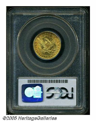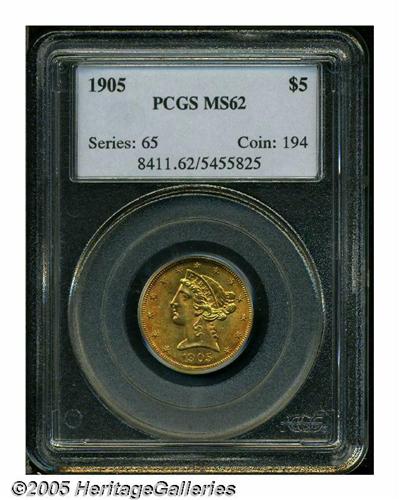 <B>1905<$5> MS62 PCGS.</B></I> This intricately struck Liberty Half Eagle displays deep orange-red hues across the obverse margin, while the reverse border offers rose-gold color. Relatively unblemished for the grade.