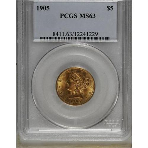 <B>1905 $5 MS63 PCGS.</B></I> PCGS Population (265/167). NGC Census: (359/286). Mintage: 302,200. Numismedia Wsl. Price for NGC/PCGS coin in MS63: $925. (#8411)<BR><BR><B>Coin Engraver:</B> Christian Gobrecht<BR><BR><b>Shipping:</b> Coins & Currency (<a target="_blank" href="http://www.heritageauctions.com/common/shipping.php">view shipping information</a>)