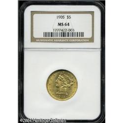1905 $5 MS64 NGC. An intricately struck and lustro <B>1905 $5 MS64 NGC.</B></I> An intricately struck and lustrous near-Gem with a well preserved portrait and only a few very faint luster grazes in the fields. <BR><BR><B>Important notice:</B> Heritage usually auctions material at the rate of 200-250 lots per hour. On some occasions eBay Live bid software or the Internet may not be able to keep up with the pace of the auction. We recommend placing a realistic absentee bid now as insurance to avoid disappointment. Occasionally the auctioneer may eliminate or reject an eBay Live bid, and the auctioneer may also reopen a lot after the close of the eBay live bidding (usually because we missed an audience bid), and may reject your bid even if it shows you as the winning bidder. By bidding via eBay Live, you agree that Heritage may award the lot to another bidder at its sole discretion under the circumstances described above or any other reasonable circumstances. Since eBay bids are not shown to us until we open the lot on the floor, we treat those bids just like floor bids. In most cases the floor responds before the eBay bid is presented to us, due to Internet lag time, so for consistency we have made it a policy that floor bids are always considered first over tie eBay live bids. Also please note that all Heritage lots purchased through eBay Live carry a 20% Buyer's Premium. Please make sure you read the Terms and Conditions before you bid. This lot is being auctioned in conjunction with a live floor auction by Heritage Galleries & Auctioneers. All final auction and invoice information will be supplied by Heritage Galleries & Auctioneers, and all other information should be considered preliminary. Lot:6687