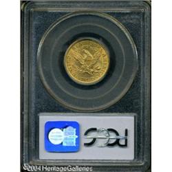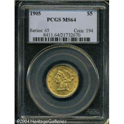 1905 $5 MS64 PCGS. Bright yellow-gold patina overl <B>1905 $5 MS64 PCGS.</B></I> Bright yellow-gold patina overlays lustrous surfaces that reveal well struck design elements. Minute marks on Liberty's cheek and neck limit the grade. Population: 93 in 64, 27 finer (10/04). <BR><BR><B>Important notice:</B> Heritage usually auctions material at the rate of 200-250 lots per hour. On some occasions eBay Live bid software or the Internet may not be able to keep up with the pace of the auction. We recommend placing a realistic absentee bid now as insurance to avoid disappointment. Occasionally the auctioneer may eliminate or reject an eBay Live bid, and the auctioneer may also reopen a lot after the close of the eBay live bidding (usually because we missed an audience bid), and may reject your bid even if it shows you as the winning bidder. By bidding via eBay Live, you agree that Heritage may award the lot to another bidder at its sole discretion under the circumstances described above or any other reasonable circumstances. Since eBay bids are not shown to us until we open the lot on the floor, we treat those bids just like floor bids. In most cases the floor responds before the eBay bid is presented to us, due to Internet lag time, so for consistency we have made it a policy that floor bids are always considered first over tie eBay live bids. Also please note that all Heritage lots purchased through eBay Live carry a 20% Buyer's Premium. Please make sure you read the Terms and Conditions before you bid. This lot is being auctioned in conjunction with a live floor auction by Heritage Galleries & Auctioneers. All final auction and invoice information will be supplied by Heritage Galleries & Auctioneers, and all other information should be considered preliminary. Lot:6686