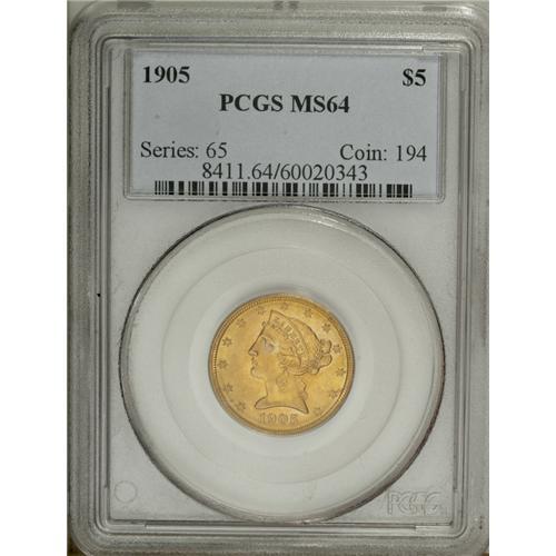 <B>1905 $5 MS64 PCGS.</B></I> This nicely struck near-Gem has typical luster and vivid orange-gold surfaces. Light marks are visible in the fields and on Liberty's chin.<BR><I>From The James Paul Collection.</B></I><BR><BR><b>Shipping:</b> Coin/Currency (<a target="_blank" href="http://www.heritageauctions.com/common/shipping.php">view shipping information</a>)