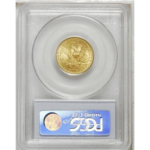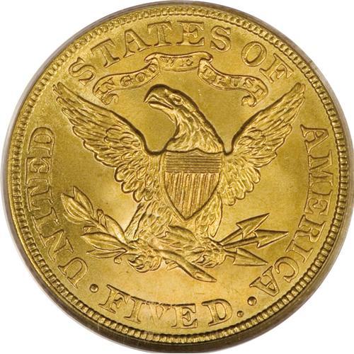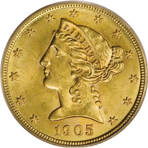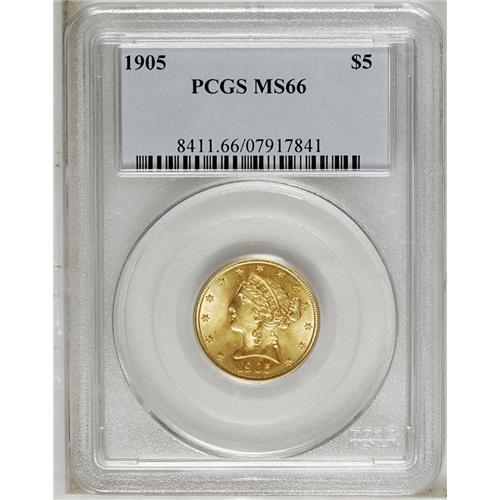 <B>1905 $5 MS66 PCGS.</B></I> In spite of its rather high mintage of 302,308 pieces, the 1905 is a surprisingly scarce issue in the better grades of Mint State. Only six pieces have been certified as Premium Gems by PCGS, with none finer (2/07). This is a lovely coin that has orange-golden and green-golden mint luster with no singularly reportable abrasions. Well defined throughout.<BR><BR><b>Shipping:</b> Coins & Currency (<a target="_blank" href="http://www.heritageauctions.com/common/shipping.php">view shipping information</a>)