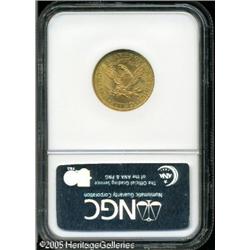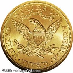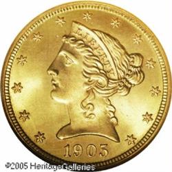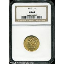<B>1905 $5 MS68 NGC.</B></I> With a mintage of 302,308 coins, this issue is not a rarity, but it is also not a common issue, but rather one of those in-between issues that does not bring much of a premium, but at the same time is elusive. Of course, in MS68 grade, this is an amazingly rare coin. In fact, this is the only MS68 example of the date certified by either PCGS or NGC. For the record, these two grading services have holdered 45 examples in MS65, 15 in MS66, and just three examples in MS67. For the entire With Motto design type, NGC has certified 12 examples in MS68 and just two finer MS69 examples.<BR> This impressive example is sharply struck with amazing detail. Perhaps we can consider this to be fully struck. Each and every star is fully delineated. Liberty's hair details are completely defined and sharp, as are all of the border dentils. Similarly, the reverse is sharply and completely detailed, including all of the minute details of the eagle's claws, tail, and wing feathers. The surfaces have fully brilliant yellow-gold luster, and they are absolutely pristine without blemishes. Just a couple tiny contact marks keep this away from perfection. If you are a collector that is seeking the ultimate and finest possible quality, or if you are a numismatic connoisseur who appreciates the best, this coin is for you. We are pleased to present this Superb Gem 1905 Liberty half eagle for your bidding consideration. Lot:7905
