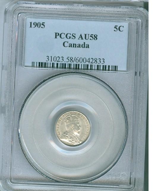 1905 5¢ PCGS AU58. Super example white in colour with nice lustre.
