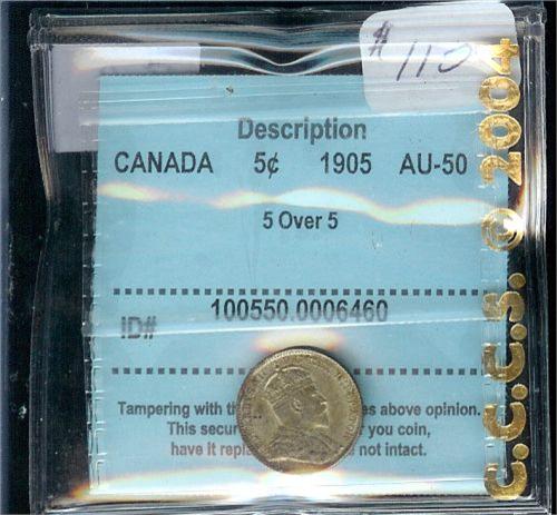 1905 5 over 5 variety 5¢ CCCS AU50. Heavy but attractive toning.