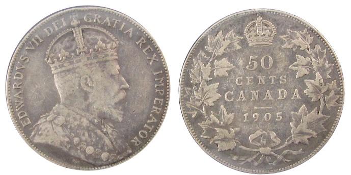 1905 50¢ ICCS VF20, lightly toned, key date.