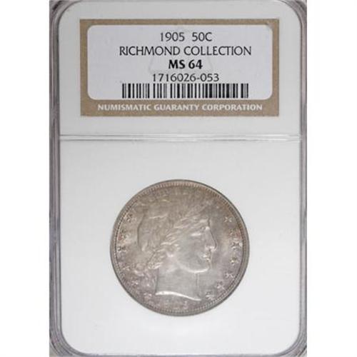 <B>1905 50C MS64 NGC.</B></I> Ex: Richmond Collection. This is a scarcer P-mint half dollar from an original mintage of only 662,000 business strikes. The surfaces are exceptionally smooth for the assigned grade with pleasing, satiny luster. Sparkling copper iridescence overlays both sides and intensifies somewhat over the reverse. Sharply struck. Census: 12 in 64, 12 finer (11/07).<BR><BR><B>Coin Engraver:</B> Charles E. Barber<BR><BR><b>Shipping:</b> Coins & Currency (<a target="_blank" href="http://www.heritageauctions.com/common/shipping.php">view shipping information</a>)