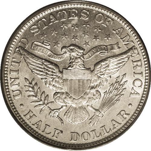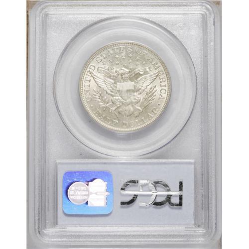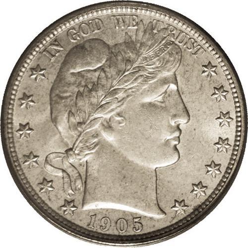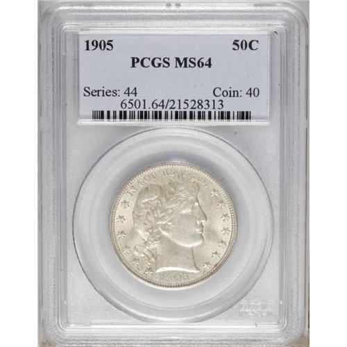<B>1905<50C> MS64 PCGS.</B></I> Luster readily penetrates the delicate honey patina. This unmarked and attractive near-Gem would likely achieve an even higher grade were it not for the strike, which is slightly soft on the cheek and near the right shield corner. The relatively low mintage 1905 is collectible but scarce in Mint State. Population: 21 in 64, 14 finer (8/06).