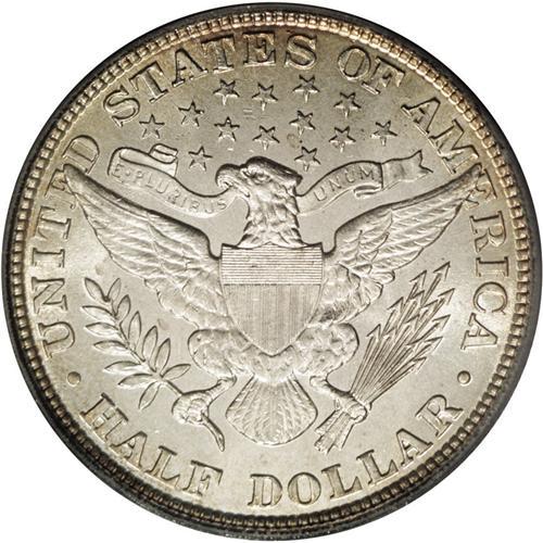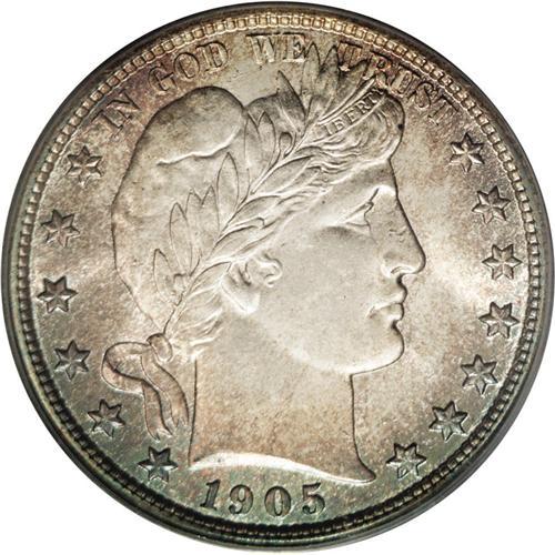 <B>1905 50C MS65 PCGS.</B></I> Toned with light aqua-blue on the obverse periphery with russet-gold through the fields with the centers still bright white. Lighter peripheral gold on the reverse and generally bright white to the center. The strike is quite sharp on the eagle's claw and arrow feathers, areas which are frequently weak. Great eye appeal for the grade, and identifiable by a minor nick on Liberty's nose. Population: 8 in 65, 6 finer (12/05).