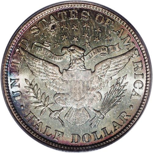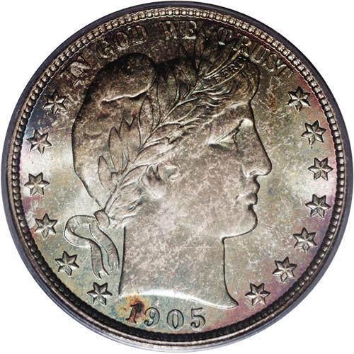 <B>1905<50C> MS67 PCGS.</B></I> This is a coin for the ages, one that is both Superb in color <I>and</B></I> surfaces. Note the interplay of iridescent green, gold and russet spanning the obverse and reverse, which come alive when examined under a light. Luster peeks through as the toning is neither dark or thick. As to the strike, the finer points of the design elements are fairly clear, although we note a whisper of weakness on the arrow feathers. This is typical of the Philadelphia Mint coinage, which are generally well struck as opposed to most of the branch mints, where striking quality varies from year to year and coin to coin. While note a particularly rare date, the mintage of 662,000 pieces keeps this one in the scarcer than average class for the series. However, in this Superb Mint State condition, this issue is as rare as the lowest mintage dates, with a grand total of two coins graded this high by PCGS, and none finer (3/06). Housed in an older green insert PCGS holder and worthy of the finest Barber half dollar collection. <BR><BR><B>Important notice:</B> Heritage usually auctions material at the rate of 200-250 lots per hour. On some occasions eBay Live bid software or the Internet may not be able to keep up with the pace of the auction. We recommend placing a realistic absentee bid now as insurance to avoid disappointment. Occasionally the auctioneer may eliminate or reject an eBay Live bid, and the auctioneer may also reopen a lot after the close of the eBay live bidding (usually because we missed an audience bid), and may reject your bid even if it shows you as the winning bidder. By bidding via eBay Live, you agree that Heritage may award the lot to another bidder at its sole discretion under the circumstances described above or any other reasonable circumstances. Since eBay bids are not shown to us until we open the lot on the floor, we treat those bids just like floor bids. In most cases the floor responds before the eBay bid is presented to us, due to Internet lag time, so for consistency we have made it a policy that floor bids are always considered first over tie eBay live bids. Also please note that all Heritage lots purchased through eBay Live carry a 20% Buyer's Premium. Please make sure you read the Terms and Conditions before you bid. This lot is being auctioned in conjunction with a live floor auction by Heritage Galleries & Auctioneers. All final auction and invoice information will be supplied by Heritage Galleries & Auctioneers, and all other information should be considered preliminary. Lot:2060 <BR><BR><B>Winning Notification and Billing:</B> After the FINAL session in this auction is complete, Heritage will send e-mail and snail mail invoices. This process normally takes several days. All final auction and invoice information will be supplied by Heritage Galleries & Auctioneers, and all other information should be considered preliminary. <BR><BR>This auction will be conducted on a live auction floor and over the Internet through eBay Live. If you choose to place an absentee bid, please take a moment to <font color='#0000ff'><u><a href='http://pages.ebay.com/liveauctions/help/before/laabsentee.html'>learn how eBay Live absentee bidding works</a></u></font><font color='#000000'>