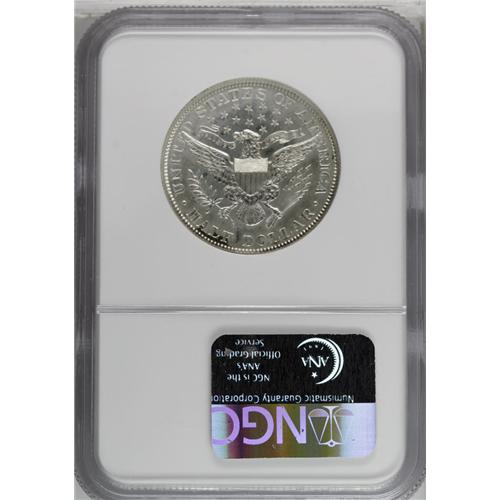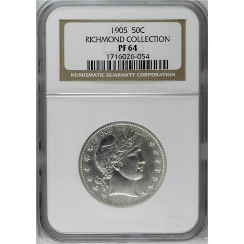 <B>1905<50C> PR64 NGC.</B></I> Ex: Richmond Collection. This meticulously struck near-Gem does not display obvious hairlines, and only faint peach toning is present aside from a steel-gray wisp near HALF. A scant 727 proofs were issued.