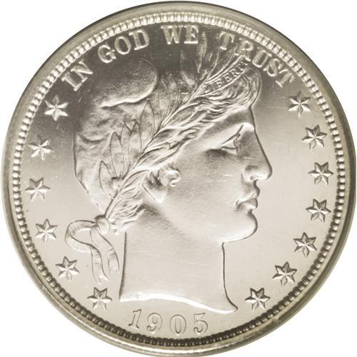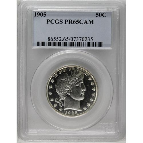 <B>1905<50C> PR65 Cameo PCGS.</B></I> This is an enchanting coin whose glassy surfaces shimmer without the distraction of any toning what-so-ever. Fully defined, as befits a proof striking, both sides are free of all but the most trivial distractions. The desirability of this coin is further enhanced by the low mintage (662,000 pieces) of its business strike counterpart. Due to production procedures for proof coins at the Mint, '05 cameo specimens are quite rare. Population: 4 in 65 Cameo, 3 finer (6/06).