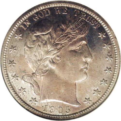 <B>1905 50C PR65 NGC.</B></I> Due to changes in the Mint's production techniques, Cameo proof examples beginning in 1902 are much scarcer than those of earlier years. The specimen here is an attractive Gem proof that does exhibit a modest degree of contrast. Each side is toned in heather and pale gold, intermingled with considerable brighter silver color. Census: 27 in 65, 35 finer (1/06).