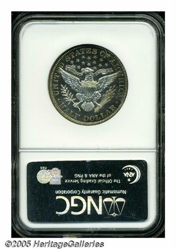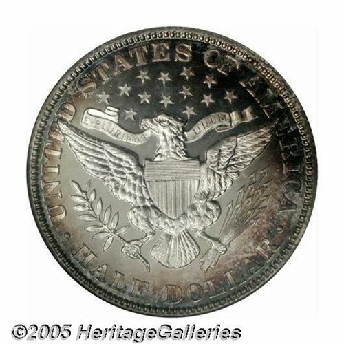 <B>1905<50C> PR66 Cameo NGC.</B></I> Due to changes in the Mint's production techniques, Cameo proof examples beginning in 1902 are much scarcer than those of earlier years. This Premium Gem specimen displays windows of brilliance across the centers, being attractively about the margins in steel-blue and russet shades. Population: 1 in 66 Cameo, 2 finer (5/05).