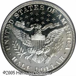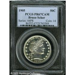 <B>1905 50C PR67 Cameo PCGS.</B></I> Since the Philadelphia mint produced a relatively limited number of business strike Half Dollars in 1905, proofs are always in demand among collectors who require a representative of this early 20th century issue. The present specimen is an important coin in its own right, inasmuch as the surfaces have been uncommonly well preserved iand q they exhibit a pronounced cameo appearance. Other than a slight area of softness on the eagle's right wing at the juncture of the shield, there is no bothersome lack of detail in any other area on this spectacular proof. Presenting as untoned, just a hint of milky color is seen in the reverse field under close examination. A beautiful example that has obviously been well cared for since the day of issue. Population: 9 in 67, 1 finer (1/05).<BR><I>From the Bruce Scher #1 All-Time PCGS Registry Set.</B></I> Lot:4121