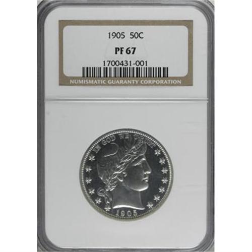 <B>1905 50C PR67 NGC.</B></I> The 1905 proof half dollar comes with a mintage of 727 coins. A relatively large number have been certified by NGC and PCGS through PR65, but the numbers drop significantly in higher grades. This Superb example is one of just 18 PR67 pieces, and only five specimens have graded finer. Essentially untoned surfaces display sharply defined design elements. Impeccably preserved, which further enhances the coin's great eye appeal.<BR><BR><B>Coin Engraver:</B> Charles E. Barber<BR><BR><b>Shipping:</b> Coins & Currency (<a target="_blank" href="http://www.heritageauctions.com/common/shipping.php">view shipping information</a>)