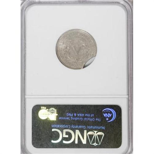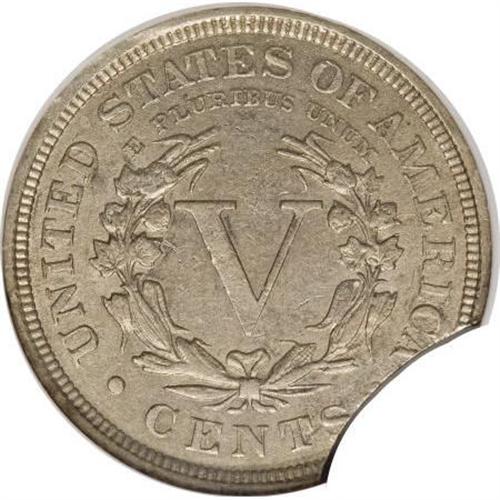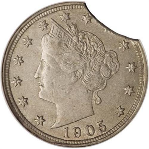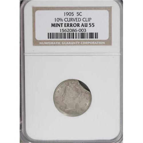 <B>1905 5C Liberty Nickel--10% Curved Clip--AU55 NGC.</B></I> The obverse has a curved clip from 12:30 to 2 o'clock. The Blakesley effect is apparent, with considerable weakness on the obverse rim near 7:30, but only minor incompleteness on the rim above the ST in STATES. This satiny nickel has chestnut and dove-gray toning. A small but interesting spoon-shaped flaw is present on Liberty's cheek.<BR><BR><B>Coin Engraver:</B> Charles E. Barber<BR><BR><b>Shipping:</b> Coins & Currency (<a target="_blank" href="http://www.heritageauctions.com/common/shipping.php">view shipping information</a>)