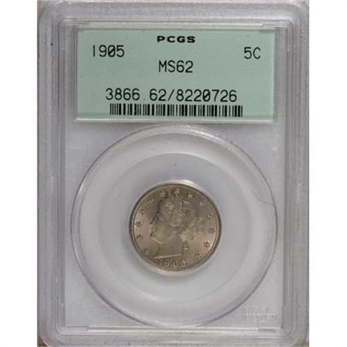 <B>1905 5C MS62 PCGS.</B></I> PCGS Population (67/794). NGC Census: (68/550). Mintage: 29,827,276. Numismedia Wsl. Price for NGC/PCGS coin in MS62: $72. (#3866)<BR><BR><B>Coin Engraver:</B> Charles E. Barber<BR><BR><b>Shipping:</b> Coins & Currency (<a target="_blank" href="http://www.heritageauctions.com/common/shipping.php">view shipping information</a>)