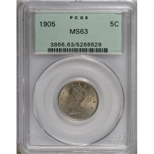 <B>1905 5C MS63 PCGS.</B></I> PCGS Population (207/586). NGC Census: (131/419). Mintage: 29,827,276. Numismedia Wsl. Price for NGC/PCGS coin in MS63: $93. (#3866)<BR><BR><B>Coin Engraver:</B> Charles E. Barber<BR><BR><b>Shipping:</b> Coins & Currency (<a target="_blank" href="http://www.heritageauctions.com/common/shipping.php">view shipping information</a>\)